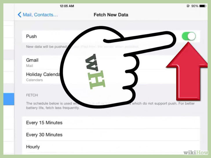 Go to “Settings”. Tap on “Mail, Contacts, Calendars” and go to “Fetch New Data”. Tap “Manually”.