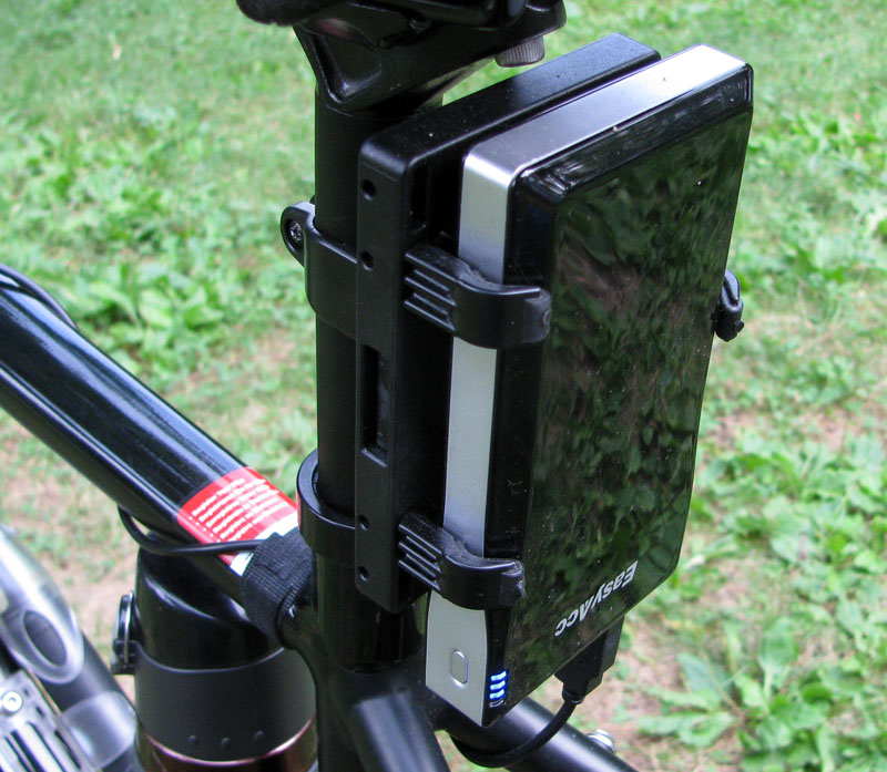 I also have an EasyACC 12,000mAh USB battery mounted to the rear of the seat post, which simultaneously charges both the GPS and PSP with a single cable, and also has three remaining USB charging ports available for use. With a fully charged PSP and GPS, the EasyACC battery provides a total operating time of about 20 hours between charging, with both the PSP and GPS screens set at full brightness. At minimum brightness settings, time between charging is about 30 hours. With only one of the two devices turned on, time between charging doubles. When it comes time to recharge, I roll my bike over by my computer and charge the battery with a standard Micro USB cable.