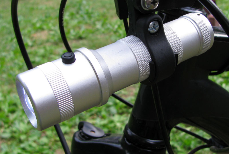 My current headlamp is also a good bit more sophisticated than the incandescent lamps of days gone by, though it’s not a dedicated bike headlamp. I’m using an aluminum-bodied Chinese RGB LED flashlight, which has diffuse omnidirectional output, a wide range of color settings and a flash capability. The lamp is inherently shockproof, has a waterproof body, and the ability to change colors provides maximum versatility. Its only significant drawback is that it cannot take advantage of the USB battery – the lamp requires three AAA batteries which must be changed periodically.