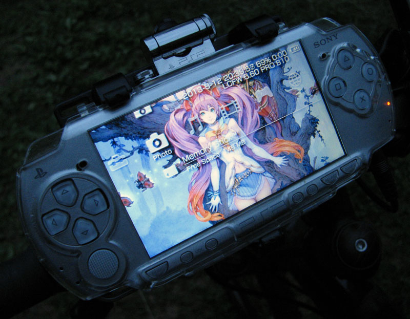 By itself however, a GPS does not have the sort of high power computing capabilities you really need to stand out among the other nerd bikes. For my main vehicular computer, instead of relying on an inept and reprehensible smartphone, I decided to use a highly optimized Sony PSP with custom firmware, 128GB of flash memory and a PSP-300 camera. On bike rides, the PSP is primarily used to record video, but is also suitable for playing music, movies and games when appropriate. In its current configuration, the PSP is equipped with 101 full length movies, 141 PSP games, 30 Playstation games, 20 vintage game system emulators with several thousand game ROMs, several gigabytes of music in MP3 format, and a wide range of software and utilities. It is literally the most maximized PSP in existence.