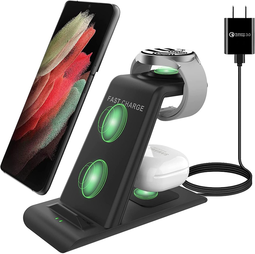 [COMPATIBLE MODES] The wireless charger station charge most qi phones with case(up to 3mm), but magnet, metal or card may prevent charging. 10W fast charging Samsung wireless charger for galaxy S22 Ultra/S22/S22+/s21/ultra/21+,S20/5G/S20+/S10/S10+/S9/S8,Note 20/Note10+/10/10e/9,Galaxy Z Fold 3 5G/Flip 3/Flip,iPhone 13,12 etc., 7.5W for iPhone 11 Pro Max/XS MAX/XR/X/8 plus. 5W for galaxy watch 4/ watch 3 41mm/45mm/Active 1 2 40mm/44mm,Galaxy Buds2, buds live/Pro and multiple android accessories.